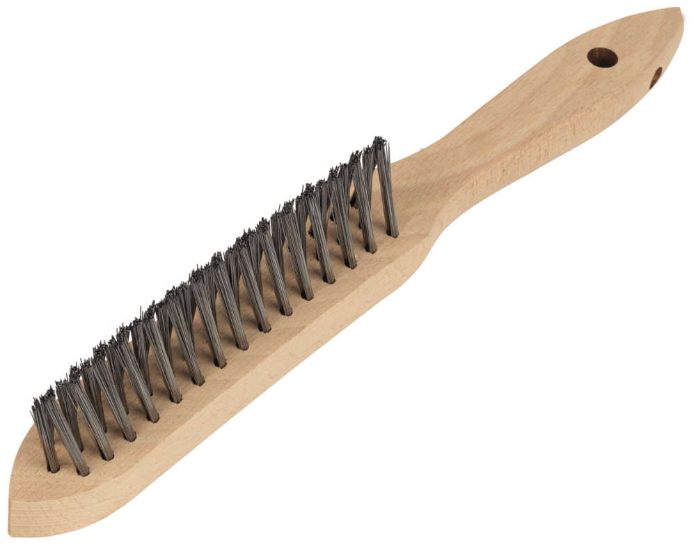 Brosse métallique en fils plats forme en V, à manche bois en hêtre.