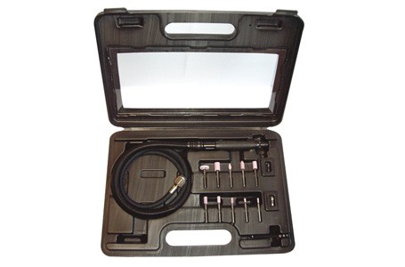 Coffret complet comprenant la meuleuse en 3 mm avec échappement canalisé, une pince de 1 mm et une pince de 1/8", plus un jeu de 10 meules sur tige et un jeu de clés de service